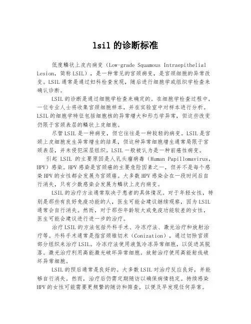 lsil的诊断标准(一)LSIL的诊断标准简介LSIL全称为低度上皮内病变(Low-grade Squamous Intraepithelial Lesion),是一种常见的宫颈细胞学变异。