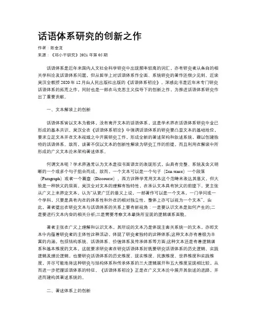 话语体系研究的创新之作作者:陈金龙来源:《邓小平研究》2021年第05期话语体系是近年来国内人文社会科学研究中出现频率较高的词汇,亦有研究者从各自的相关学科论及话语体系问题,但从哲学上对话语体系作全面、系统研究的著作还很少见到。