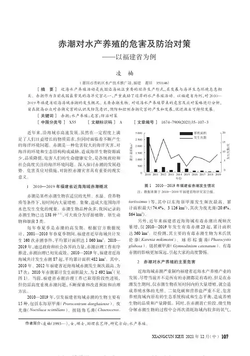 赤潮对海水养殖的危害一赤潮概述赤潮(red tide,red water,dis-colored water)又称红潮,是海洋生态系统中的一种异常现象,是由赤潮藻在特定环境条件下爆发性增殖造成的,现已成为海洋六大灾害之一。