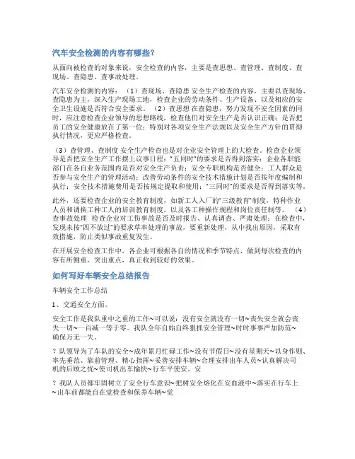 汽车安全检测的内容:(1)查现场、查隐患安全生产检查的内容,主要以查现场、查隐患为主,深入生产现场工地,检查企业的劳动条件、生产设备、以及相应的安全卫生设施是否符合安全要求。