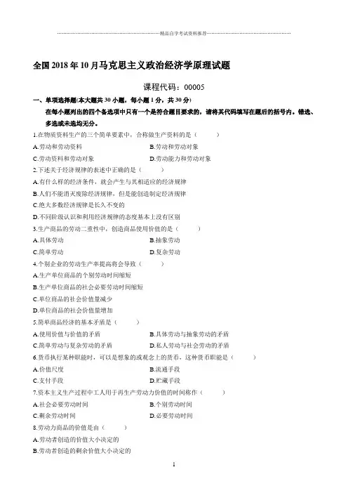 全国2018年10月马克思主义政治经济学原理试题课程代码:00005一、单项选择题(本大题共30小题,每小题1分,共30分)在每小题列出的四个备选项中只有一个是符合题目要求的,请将其代码填写在题后的括号内。