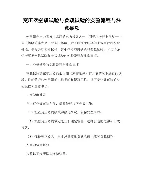 一、空载试验的实施步骤与流程1. 准备工作在进行空载试验之前,首先需要准备好相应的测试设备和仪器,如电流表、电压表、瓦特表等。
