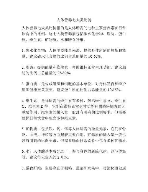 人体所需七大营养素人体所需七大营养素是指人体必须摄入的七种营养物质,包括碳水化合物、蛋白质、脂肪、维生素、矿物质、水和膳食纤维。
