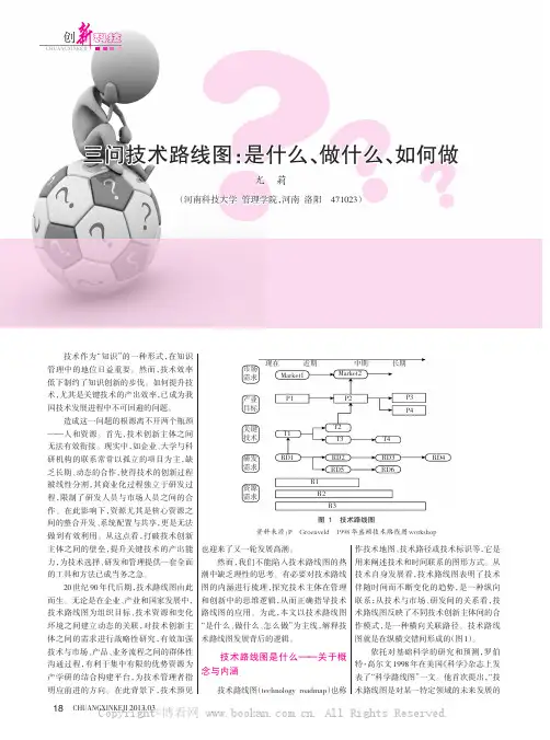 同时,作为一种产品,纵向上它有力地将目标、资源及市场有机结合起来,并明确它们之间的关系和属性,横向上它可以将过去、现在和未来统一起来,既描述现状,又预测未来;作为一种方法,它可以广泛应用于技术规划管理、行业未来预测、国家宏观管理等方面.技术路线图的缘起技术路线图最早出现在美国汽车行业,汽车企业为降低成本要求供应商提供他们产品的技术路线图。