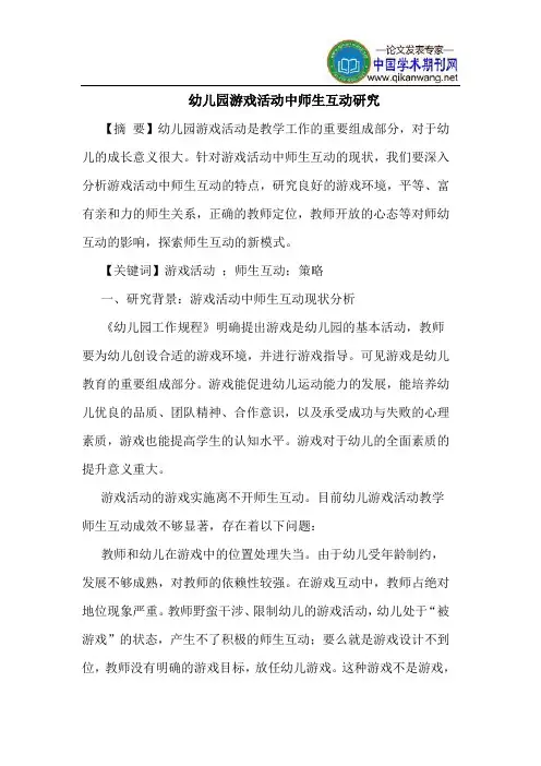 【关键词】游戏活动;师生互动;策略一、研究背景:游戏活动中师生互动现状分析《幼儿园工作规程》明确提出游戏是幼儿园的基本活动,教师要为幼儿创设合适的游戏环境,并进行游戏指导。
