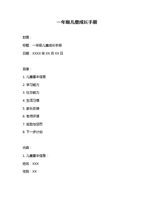 一年级儿童成长手册封面:标题:一年级儿童成长手册日期:XXXX年XX月XX日目录:1. 儿童基本信息2. 学习能力3. 社交能力4. 生活习惯5. 家长反馈6. 老师评语7. 奖励与惩罚8. 下一步计划内容:1. 儿童基本信息:姓名:XXX性别:XX出生日期:XXXX年XX月XX日家庭住址:XXXXXXXXXXXXXXX联系方式:XXXXXXXXXXX2. 学习能力:学科表现:语文、数学、英语等各科成绩及表现记录。