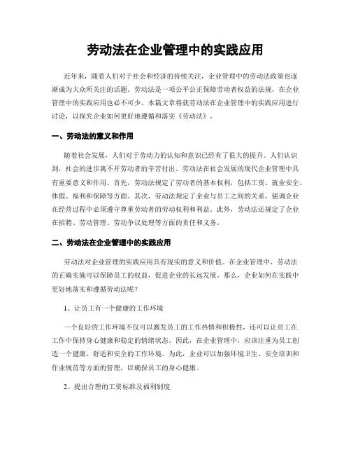 一、劳动法在企业内的应用1. 保障劳动者基本权益劳动法规定了劳动者的基本权益,如劳动报酬、工作时间、休假制度等。