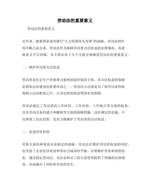 2. 劳动法的作用劳动法的出现,首先是为了保障劳动者的基本生存与发展需要,确保他们在劳动过程中受到公平待遇。
