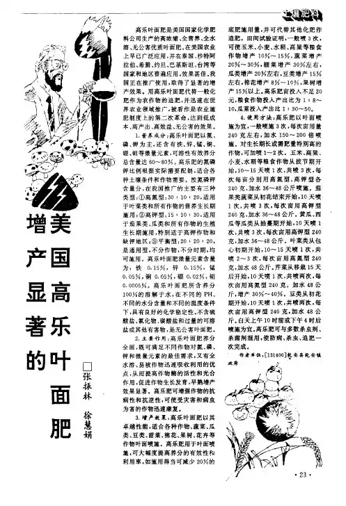 河南农业年第期N NNONGY 根外追肥就是把含有一定营养元素的肥料配成适宜浓度的溶液,以喷雾的形式喷洒在作物叶片上供其吸收。
