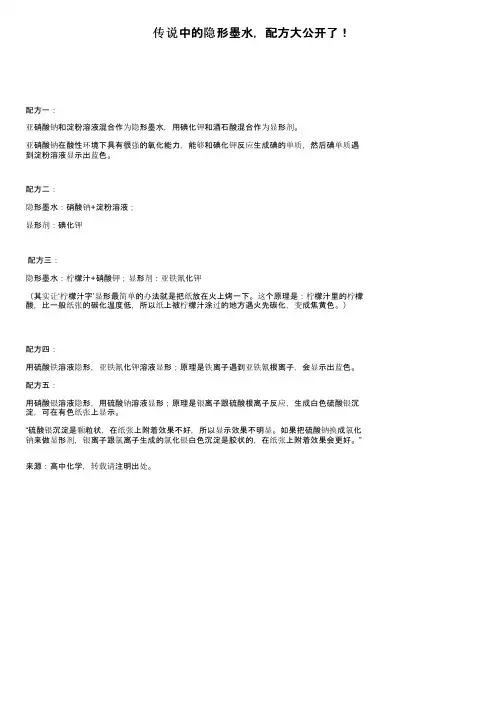隐形墨水:柠檬汁+硝酸钾;显形剂:亚铁氰化钾
