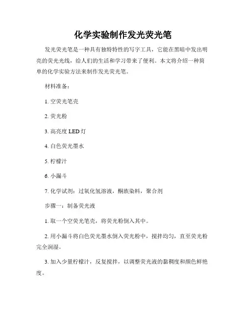 化学实验制作发光荧光笔发光荧光笔是一种具有独特特性的写字工具,它能在黑暗中发出明亮的荧光光线,给人们的生活和学习带来了便利。