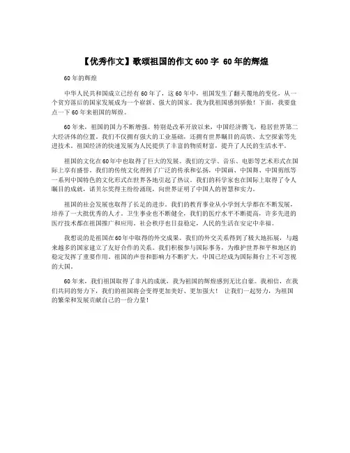 庆祝建国60周年征文-六十年巨变六十年辉煌(精选5篇)第一篇:庆祝建国60周年征文-六十年巨变六十年辉煌庆祝建国60周年征文:六十年巨变六十年辉煌龙舞神州,腾飞中国,新中国的各项事业蒸蒸日上,伟大的中华民族正以昂扬的姿态昂首阔步积极的走向世界。