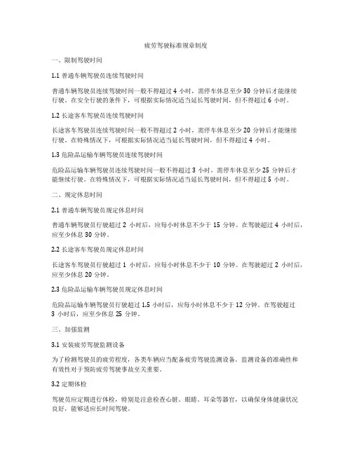 疲劳驾驶标准规章制度一、限制驾驶时间1.1 普通车辆驾驶员连续驾驶时间普通车辆驾驶员连续驾驶时间一般不得超过4小时,需停车休息至少30分钟后才能继续行驶。