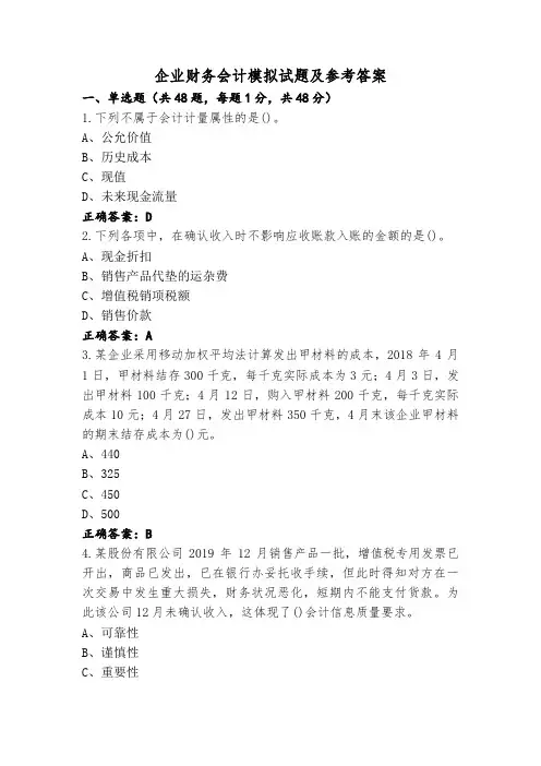企业财务会计模拟试题及参考答案一、单选题(共48题,每题1分,共48分)1.下列不属于会计计量属性的是()。