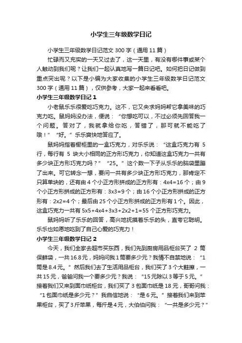小学生三年级数学日记300字(精选10篇)1.小学生三年级数学日记300字篇一今天晚上,我和妈妈来到超市买东西。