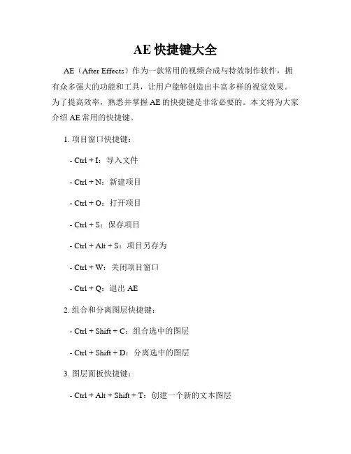 1. 项目窗口快捷键:- Ctrl + I:导入文件- Ctrl + N:新建项目- Ctrl + O:打开项目- Ctrl + S:保存项目- Ctrl + Alt + S:项目另存为- Ctrl + W:关闭项目窗口- Ctrl + Q:退出AE2. 组合和分离图层快捷键:- Ctrl + Shift + C:组合选中的图层- Ctrl + Shift + D:分离选中的图层3. 图层面板快捷键:- Ctrl + Alt + Shift + T:创建一个新的文本图层- Ctrl + Alt + Shift + Y:创建一个新的空白图层- Ctrl + Alt + Shift + V:创建一个新的null对象4. 时间线面板快捷键:- Ctrl + ]:将图层向上移动一层- Ctrl + [:将图层向下移动一层- Ctrl + Alt + ]:将图层移动到顶层- Ctrl + Alt + [:将图层移动到底层- Ctrl + K:打开合成设置- Ctrl + Alt + ;:放大合成时间线- Ctrl + Alt + ':缩小合成时间线- Ctrl + Alt + Shift + ;:向右滚动时间线- Ctrl + Alt + Shift + ':向左滚动时间线- Alt + 方向键:将图层移动1帧5. 预览窗口快捷键:- 空格键:开始或停止播放- Ctrl + 空格键:以预览区域为中心开始播放- 0(数字键盘):将当前时间拖动到预览面板中心- .(小数点):将当前时间拖动到预览面板中心,并播放1帧6. 快速选择图层快捷键:- V:选择图层工具- A:选择直线选择工具- P:选择位置工具- R:选择旋转工具- S:选择缩放工具- T:选择不透明度工具- Q:选择椭圆工具- U:选择画刷工具7. 实用工具快捷键:- Ctrl + D:复制选中的图层- Ctrl + Shift + D:创建选中图层的副本,并以原始图层为基础创建一个新的合成- Ctrl + Alt + V:替换选中的图层8. 其他快捷键:- Ctrl + Z:撤销- Ctrl + Shift + Z:重做- Ctrl + Alt + Z:逐步后退- Ctrl + Shift + T:显示/隐藏所有的图层属性- Ctrl + H:隐藏/显示图层面板这些快捷键只是AE中的一小部分,熟练掌握这些快捷键将大大提高您在AE中的工作效率。