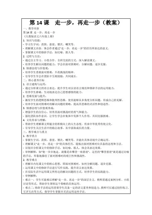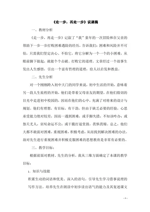 一、教学目标1.理解课文《走一步,再走一步》的主题思想,感受作者在困境中勇敢面对、积极进取的精神风貌。