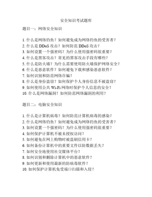 安全知识考试题库题目一:网络安全知识1. 什么是网络钓鱼?如何避免成为网络钓鱼的受害者?2. 什么是DDoS攻击?如何防范DDoS攻击?3. 如何设置一个强密码?为什么使用强密码很重要?4. 什么是黑客攻击?常见的黑客攻击手段有哪些?5. 什么是防火墙?为什么需要使用防火墙保护网络安全?6. 什么是恶意软件?如何避免下载和感染恶意软件?7. 如何识别和防范网络诈骗?8. 什么是身份盗窃?如何保护个人身份信息不被盗窃?9. 如何使用公共Wi-Fi网络时保护个人信息的安全?10. 什么是网络漏洞?如何防范网络漏洞的利用?题目二:电脑安全知识1. 什么是计算机病毒?如何防范计算机病毒的感染?2. 什么是网络钓鱼?如何避免成为网络钓鱼的受害者?3. 如何设置一个强密码?为什么使用强密码很重要?4. 如何保护计算机不被未授权访问?5. 如何避免在网上购物时被盗刷信用卡?6. 如何备份计算机中的重要文件以防数据丢失?7. 如何安全地使用社交媒体平台?8. 如何识别和删除计算机中的恶意软件?9. 如何更新和使用最新的防病毒软件?10. 如何保护计算机免受端口扫描和入侵?题目三:移动设备安全知识1. 如何设置移动设备密码以保护个人信息?2. 什么是移动设备远程擦除功能?为什么要使用远程擦除功能?3. 如何避免下载和感染恶意应用程序?4. 如何防范移动设备的Wi-Fi网络攻击?5. 如何识别和防范移动设备的网络钓鱼?6. 如何设置和使用移动设备的设备定位功能?7. 如何防范移动设备的蓝牙攻击?8. 如何保护移动设备中存储的个人照片和视频不被盗窃或泄露?9. 如何防止移动设备在公共场所被盗窃?10. 如何安全地使用移动设备进行在线银行和支付交易?题目四:社交媒体安全知识1. 如何设置强密码以保护社交媒体账户的安全?2. 如何防止社交媒体账户被黑客攻击?3. 如何保护个人隐私在社交媒体上不被泄露?4. 如何识别和防范社交媒体的网络诈骗?5. 如何防范社交媒体的身份盗窃?6. 如何安全地使用社交媒体上的连接和应用程序?7. 如何避免在社交媒体上发布过多的个人信息?8. 如何防范社交媒体账户被他人冒充?9. 如何防止社交媒体账户被他人恶意使用?10. 如何安全地使用社交媒体平台进行在线交流和分享?。