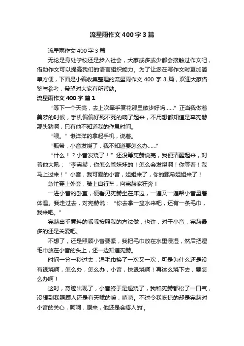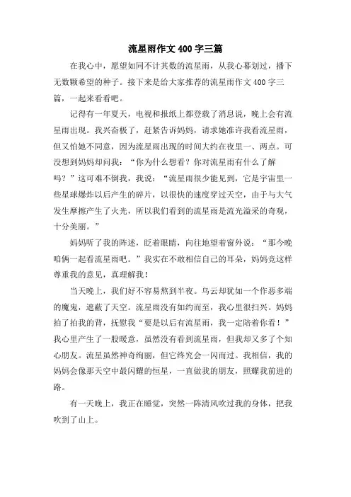 为了让您在写作文时更加简单方便,下面是小编收集整理的流星雨作文400字3篇,欢迎大家借鉴与参考,希望对大家有所帮助。