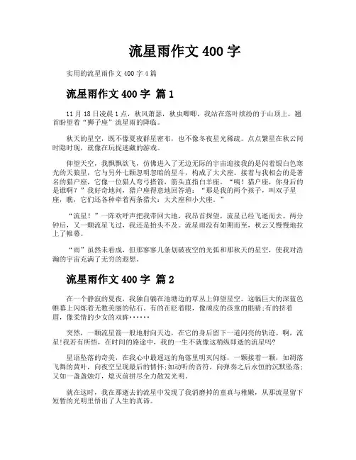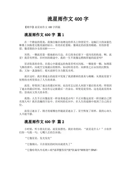 流星雨作文400字【精华】流星雨作文400字四篇流星雨作文400字篇1在一个静寂的夏夜,我独自躺在池塘边的草丛上仰望星空。