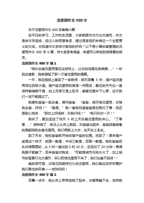 你知道作文怎样才能写的好吗?以下是小编收集整理的流星雨作文400字6篇,供大家参考借鉴,希望可以帮助到有需要的朋友。