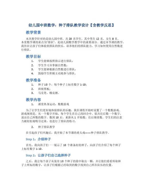教学准备:1.种子瓶(不同种类的种子)2.白纸、彩色笔3.数字卡片教学过程:一、引入新课1.引出课题:“同学们,你们有没有看过种子?你们知道吗,种子我们可以进行排队哦!”2.出示不同种类的种子:“请问,同学们,你们知道这是什么?这些是不同种类的种子,我们今天就来学习种子的排队方法。