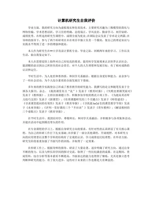 计算机研究生的自我鉴定计算机研究生的自我鉴定精选3篇(一)作为一名计算机研究生,我深知自己在这个领域中所扮演的角色和责任。