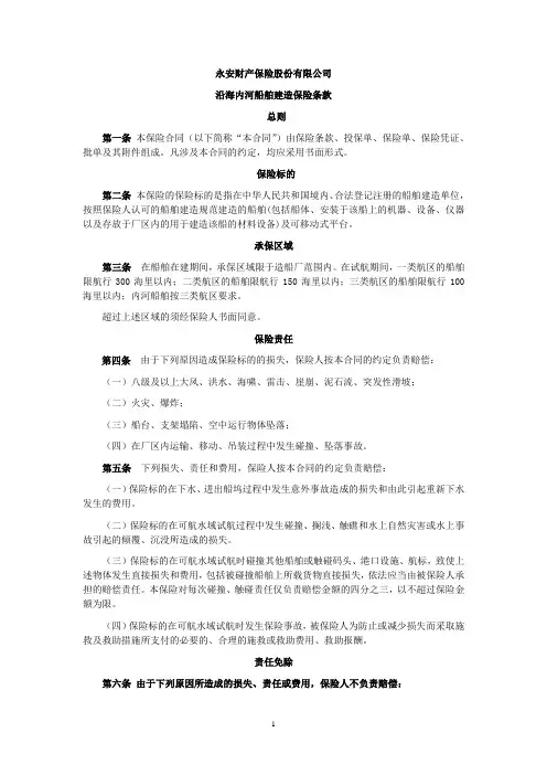 永安财产保险股份有限公司沿海内河船舶建造保险条款总则第一条本保险合同(以下简称“本合同”)由保险条款、投保单、保险单、保险凭证、批单及其附件组成。