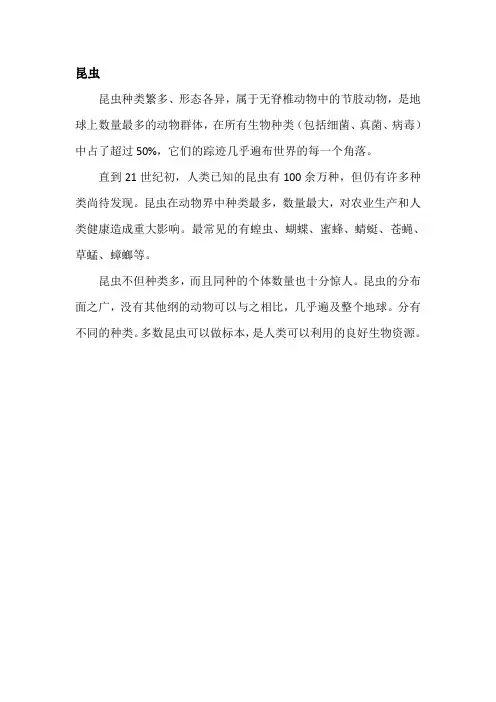 昆虫种类繁多、形态各异,属于无脊椎动物中的节肢动物,是地球上数量最多的动物群体,在所有生物种类(包括细菌、真菌、病毒)中占了超过50%,它们的踪迹几乎遍布世界的每一个角落。