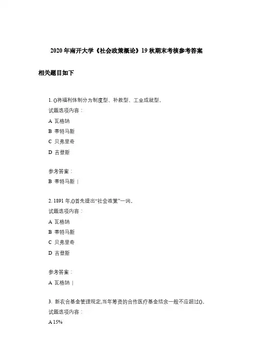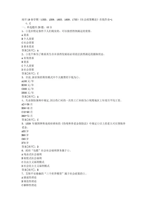 南开19春学期(1503、1509、1603、1609、1703)《社会政策概论》在线作业4、C一、单选题共20题,40分1、国际劳工组织的社会政策理念是()。