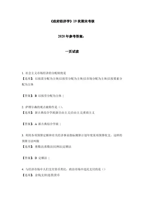 19秋学期(1709、1803、1809、1903、1909)《社会政策概论》在线作业-0001------------------------1.从运行原则上看,社会政策属于()原则的领域.A.福利性B.公共性C.权威性D.商业性正确答案:A2.()强调社会政策与经济发展的协调性。