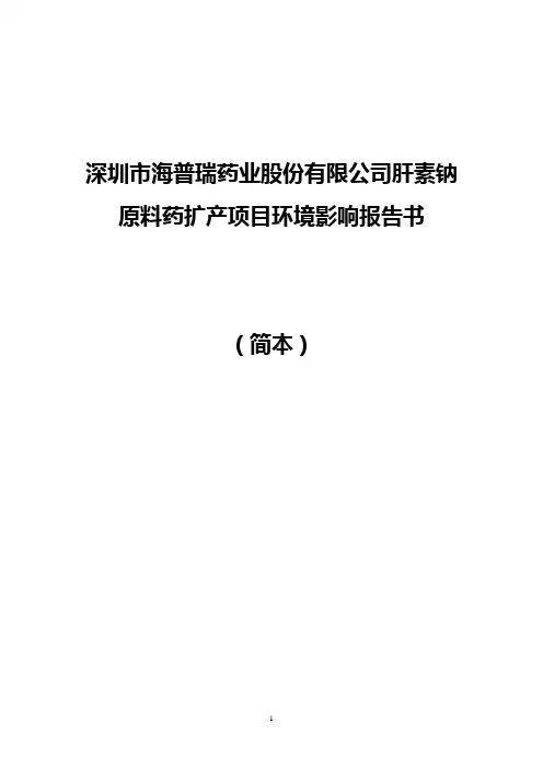深圳市海普瑞药业股份有限公司肝素钠原料药扩产项目环境影响报告书(简本)编制单位:天津市环境保护科学研究院协作单位:深圳市环境科学研究所目录1、项目概况 (1)1.1项目位置 (1)1.2建设内容及规模 (1)2 已建项目环境影响回顾性评价 (5)3、工程环境影响分析 (6)3.1施工期污染源 (6)3.2运营期污染源 (7)4、环境质量现状调查与评价 (10)4.1 大气环境质量评价 (10)4.2 声环境质量评价 (10)4.3 水环境质量评价 (10)5、施工期环影响预测与评价 (11)5.1水环境影响 (11)5.2大气环境影响 (11)5.3声环境影响 (11)5.4固体废物环境影响 (12)5.5水土流失 (12)6、运营期环境影响预测与评价 (13)6.1水环境影响评价 (13)6.2环境空气 (13)6.3环境噪声 (14)6.4固(液)体废物 (15)7、环境风险评价 (16)8项目与产业政策兼容性及先进性 (17)8.1项目选址的合理性 (17)8.2产业政策符合性分析 (17)9清洁生产 (17)9.1 清洁生产 (17)9.2工艺及生产废水回用的可行性 (18)10总量控制 (18)11主要环保措施 (18)11.1 施工期环境保护对策措施 (18)11.1.1 水环境保护 (18)11.1.2 大气环境保护 (19)11.1.3 声环境保护 (19)11.1.4 固体废物处置 (20)11.2运营期环境保护对策措施 (20)11.2.1 废水治理措施分析 (20)11.2.2 废气治理措施分析 (22)11.2.3 噪声污染防治对策分析 (22)11.2.4固(液)体废物污染防治对策分析 (23)12环境影响经济损益分析 (24)13公众调查及其分析 (24)14综合评价结论 (25)1、项目概况1.1项目位置深圳市海普瑞药业股份有限公司肝素钠原料药扩产项目位于深圳市南山区松坪山郎山路21号,项目地理位置见图1.1-1。