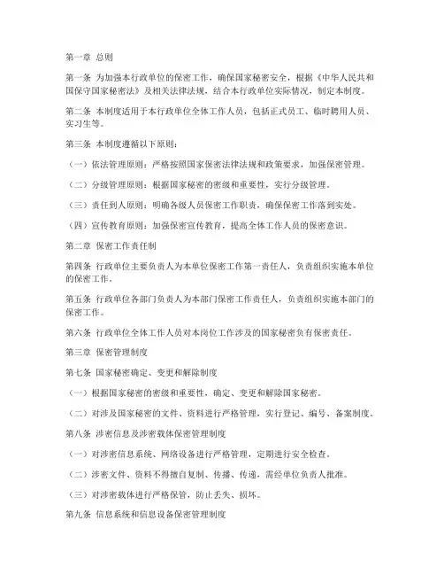 第一章总则第一条为加强本行政单位的保密工作,确保国家秘密安全,根据《中华人民共和国保守国家秘密法》及相关法律法规,结合本行政单位实际情况,制定本制度。