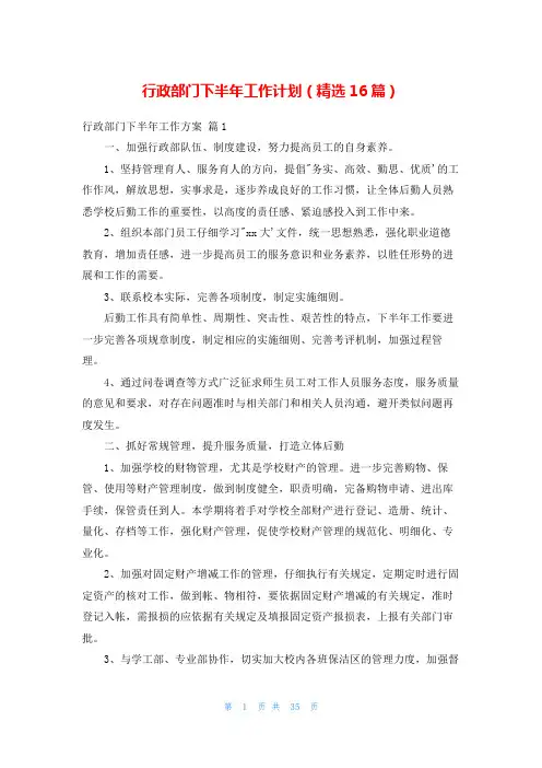 公司行政部下半年工作计划5篇篇1一、引言随着公司业务的不断拓展,行政部作为公司的重要职能部门,肩负着重要的责任和使命。