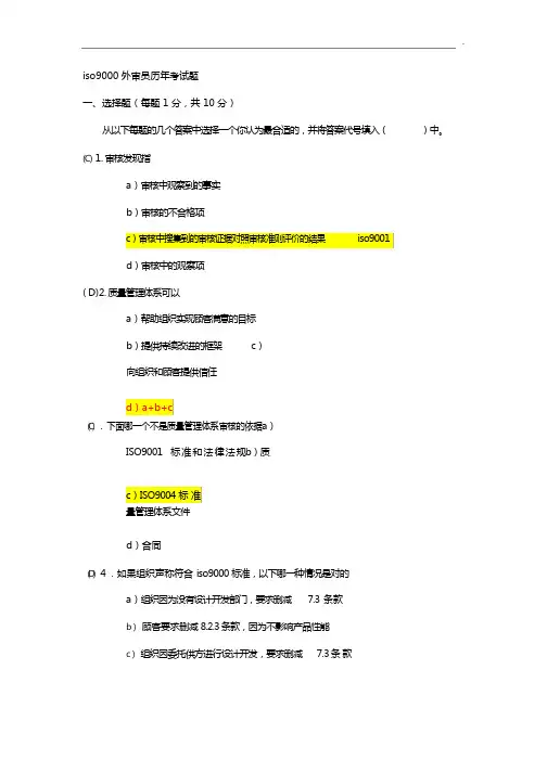 iso9000 外审员历年考试题一、选择题(每题 1 分,共 10 分)从以下每题的几个答案中选择一个你认为最合适的,并将答案代号填入()中。