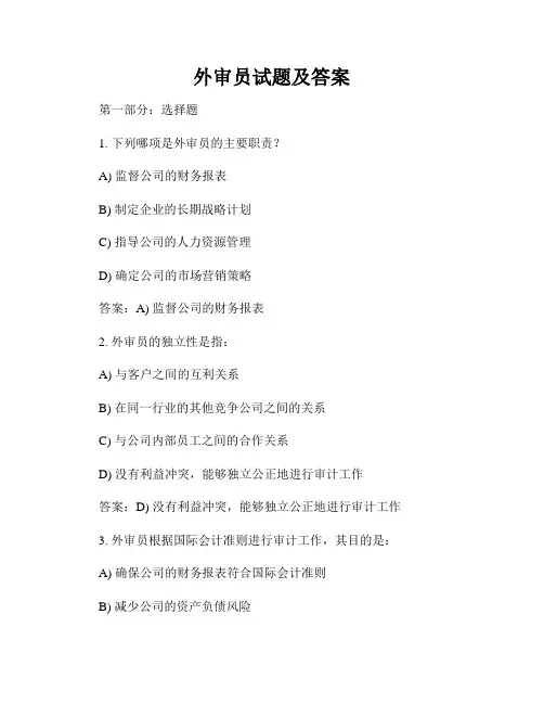 外审员试题及答案第一部分:选择题1. 下列哪项是外审员的主要职责?A) 监督公司的财务报表B) 制定企业的长期战略计划C) 指导公司的人力资源管理D) 确定公司的市场营销策略答案:A) 监督公司的财务报表2. 外审员的独立性是指:A) 与客户之间的互利关系B) 在同一行业的其他竞争公司之间的关系C) 与公司内部员工之间的合作关系D) 没有利益冲突,能够独立公正地进行审计工作答案:D) 没有利益冲突,能够独立公正地进行审计工作3. 外审员根据国际会计准则进行审计工作,其目的是:A) 确保公司的财务报表符合国际会计准则B) 减少公司的资产负债风险C) 提高公司的市场价值D) 优化公司的管理结构答案:A) 确保公司的财务报表符合国际会计准则4. 在审计初始策略中,外审员应重点关注的是:A) 公司的盈利能力B) 公司的经营风险C) 公司的股东结构D) 公司的市场份额答案:B) 公司的经营风险5. 在审计过程中,外审员通过以下哪项工作可以获得审计证据?A) 与公司管理层的会议讨论B) 参观公司的生产厂房C) 监督公司的内部控制体系D) 对公司的财务记录进行复核答案:D) 对公司的财务记录进行复核第二部分:问答题1. 外审员在进行财务报表审计时,应遵循哪些基本准则?答案:外审员进行财务报表审计时应遵循以下基本准则:- 诚实和诚信原则:外审员应诚实和诚信地履行职责,保持独立和客观的态度。