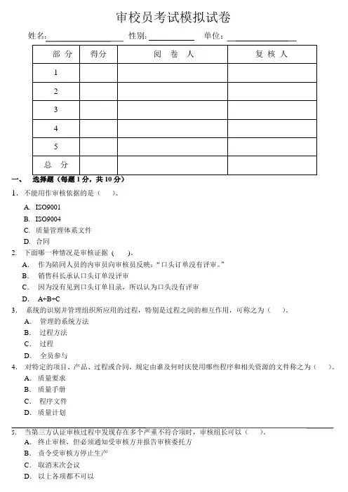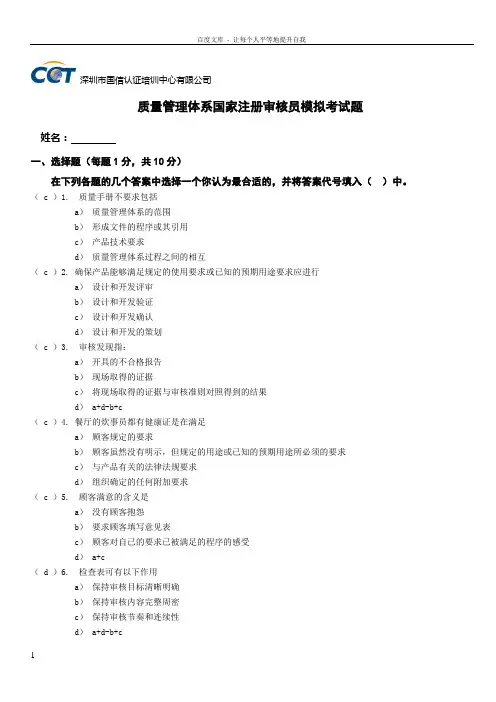 深圳市国信认证培训中心有限公司质量管理体系国家注册审核员模拟考试题姓名:一、选择题(每题1分,共10分)在下列各题的几个答案中选择一个你认为最合适的,并将答案代号填入()中。