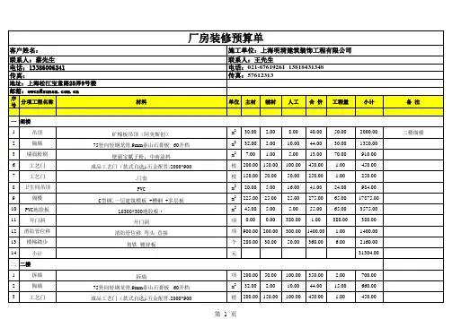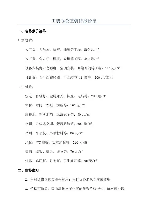 材料名称数量单位单价(元)总价(元)涂料10 桶200 2000地板80 平米100 8000瓷砖50 平米150 7500灯具10 个500 5000材料名称数量单位单价(元)总价(元)窗帘 5 米300 1500家具 1 套20000 200002.3. 人工费用在这一部分,我们将列出装修项目中所涉及的各项人工费用,并为每一项费用提供一个单价和所需数量,以便您能够了解到人工费用的构成。