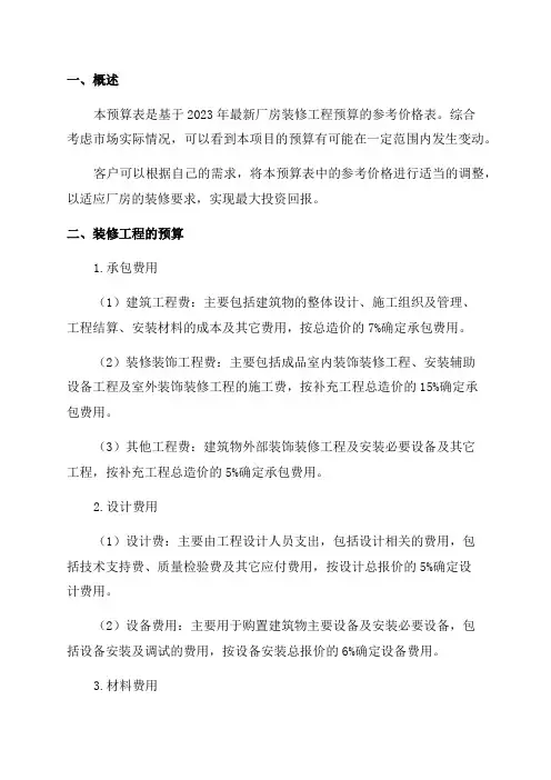 本预算表是基于2023年最新厂房装修工程预算的参考价格表。