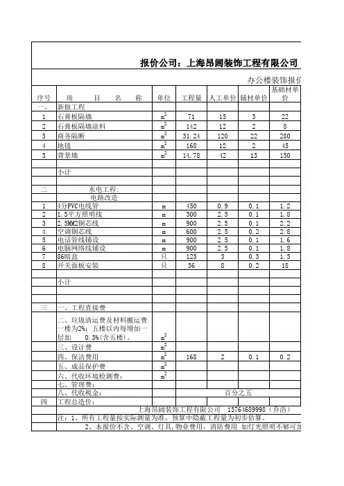 华宏生物装修工程报价明细一、总经理办公室1、吊顶:14.9*7.6=110.96㎡*78元=8654.88元2、乳胶漆:115.28㎡*18元=2075.04元3、墙面壁纸:153㎡-窗14.4㎡=138.6㎡*38元/㎡=5266.8元乳胶漆:138.6㎡*18元/㎡=2494.8元4、木地板:110.96㎡*160元/㎡=17696元5、书橱:5.8*3.2=18.56㎡*980元/㎡=18188.8元6、双面橱:2.4*7.6=18.24㎡*1080元/㎡=19699.2元7、玻璃隔断:1.5*2=3㎡*280元/㎡=840元8、窗帘盒:15.2m*38元/㎡=577.6元9、投影仪盒:2*38元/m=76元总合计:墙面用壁纸:73074.3元墙面用乳胶漆:70302.3元二、二层小会议室1、吊顶:7.6*6.2=47.12㎡*74元=3486.88元2、乳胶漆:{47.12㎡+(88.32-12.96)}*18元/㎡=2204.64元3、窗帘盒:7.6*38元/m=288.8元总合计:5980.32元三、三层会议室1、吊顶:113.24㎡*82元/㎡=9285.68元2、乳胶漆:{113.24+6㎡+(144m-24m)}*18元/㎡=4306.32元3、投影盒:3m*38元/m=114元4、窗帘盒:15.2m*38元/m=577.6元总合计:14283.6元四、四层大会议室1、吊顶:14.9m*11.2m=166.88㎡*68元/㎡=11347.84元2、乳胶漆:166.88+梁38.04㎡+墙面(167.04-28.8=138.24㎡)=343.16㎡*18元/㎡=617.88元4、窗帘盒:22.4m*38元/m=851.2元总合计:18375.92元五、四层接待室1、吊顶:6.8m*6.2m=42.16㎡*74元/㎡=3119.84元2、乳胶漆:42.16㎡+梁2.04㎡+墙面(83.2-21.216=61.984㎡) =106.18㎡*18元/㎡=1911.31元3、窗帘盒:6.8m*38元/m=258.4元总合计:5289.55元六、三层接待室1、吊顶:6.8m*6.2m=42.16㎡*82元/㎡=3457.12元2、乳胶漆:(42.16㎡+2.04㎡)*18元/㎡=795.6元3、壁纸:64.02㎡*38元/㎡=2432.76元4、地板:42.16㎡*160元/㎡=6745.6元总合计:13431.08元七、三层副总办公室1、吊顶:6.8m*6.2m=42.16㎡*78元/㎡=3288.48元2、乳胶漆:42.16㎡+6㎡+墙面(63.36+5.44-9.6)=107.36㎡*18元/㎡=1932.48元3、书橱:6.2m*2.4m=14.88㎡*980元/㎡=14582.4元4、窗帘盒:6.8m*38元/m=258.4元总合计:20061.76元八、四层副总办公室1、吊顶:7.5m*6.3m=47.25㎡*78元/㎡=3685.5元2、乳胶漆:47.25㎡+6㎡+(68.16+5.04-9.6)=116.85㎡*18元/㎡=2103.3元3、书橱:6.3m*2.4m=15.12㎡*980元/㎡=14817.6元4、窗帘盒:7.5m*38元/m=285元总合计:20891.4元九、五层活动室、娱乐室1、乳胶漆:14.9m*10.7m=159.43㎡+(194.56-28.8)=325.19㎡*18元/㎡=5853.42元2、窗帘盒:21.4m*38元/m=813.2元3、石膏线:51.2m*12元/m=614.4元总合计:7281.02元*2=14562.04元十、五层休息室1、乳胶漆:6.8m*6.2m=42.16㎡+墙面72.96㎡=115.12㎡*18元/㎡=2072.16元2、窗帘盒:6.8m*38元/m=258.4元3、石膏线:26m*12元/m=312元总合计:2642.56元十一、一层大餐厅1、吊顶:18.9m*11.2m=211.68㎡*58元/㎡=12277.44元2、乳胶漆:204.68㎡*18元/㎡=3684.24元3、包大梁:18.9m+11.2m=30.1m*100元/m=3010元4、窗帘盒:22.4m*38元/m=851.2元5、石膏线:60.2m*12元/m=722.4元总合计:20545.28元十二、一层小餐厅、车队、小办公室1、吊顶:3.3m*6.2m=20.46㎡*58元/㎡=1186.68元2、64.6-4.8=59.8㎡*18元/㎡=1076.4元3、窗帘盒:3.3m*38元/m=125.4元4、石膏线:19m*12元/m=228元总合计:2616.48*2=5232.96元十三、一层走廊大厅1、吊顶:大厅:7.2*6.6=47.52㎡*185元/㎡=8791.2元走廊:36.4*2.1=76.44㎡*58元/㎡=4433.52元2、石膏线:88.8m*12元/m=1065.6元3、乳胶漆:82.2m*3.4m=279.48㎡*18元/㎡=5030.64元总合计:19321元十四、一层大办公室1、乳胶漆:89.76-9.6=80.16㎡*18元/㎡=1442.88元2、石膏线:26.4m*12元/m=316.8元总合计:1759.68元十五、一层细胞操作间(2间)1、乳胶漆:(91.12㎡-4.8㎡)*18元/㎡=1553.76元2、石膏线:26.8m*12元/m=321.6元总合计:1875.36*2=3750.72元十六、细胞培养、胚胎培养、细菌培养、苗种间1、乳胶漆:(17.2+11.4+11.8+10.4)*3.4=172.72㎡-9.6㎡=163.12*18元/㎡=2936.16元2、石膏线:50.8m*12元/m=609.6元总合计:3545.76元十七、一层小走廊、准备间、实验室、档案室、仪器室1、小走廊吊顶:1.2m*10m=12㎡*58元/㎡=696元2、乳胶漆:329.12㎡*18元/㎡=5924.16元3、石膏线:96.8m*12元/m=1161.6元总合计:7781.76元十八、厨房、男卫、洗手间1、吊顶:10.8m*6.3m=68.04㎡*68元/㎡=4626.72元2、窗帘盒:10.8m*38元/m=410.4元总合计:5037.12元十九、热力室1、乳胶漆:6.7*3.7+(6.7+3.7)*2*3.4=95.51㎡*18元/㎡=1719.18元2、石膏线:20.8m*12元/m=249.6元总合计:1968.78元二十、二层走廊1、吊顶:43.7*1.8=78.66㎡*58元/㎡=4562.28元2、乳胶漆:309.4㎡-(1*2-1*22)=263.2㎡*18元/㎡=4737.6元总合计:9299.8元二十一、二层其它房间1、乳胶漆:顶面:(988-78.66-47.88)-13*0.3*19=787.36㎡墙面:(239.4m+68.8m+144m+15.6m)*3.4m=1590.52㎡*18元/㎡=28629.36元2、石膏线:467.8m*12元/m=5613.6元总合计:35030.32元二十二、三层走廊1、吊顶:1.8*36=64.8㎡*58元/㎡=3758.4元2、石膏线:75.6m*12元/m=907.2元3、乳胶漆:367.2-(1*2-1*18)=329.4*18元/㎡=5929.2元总合计:10594.8元二十三、三层其它房间1、乳胶漆:顶面:33*16.9=557.7㎡墙面:1384.74㎡*18元/㎡=24925.32元2、石膏线:282.6m*12元/m=3391.2元总合计:28316.52元二十四、走廊1、吊顶:1.8m*40m=72㎡*58元/㎡=4176元2、石膏线:83.6m*12元/m=1003.2元3、乳胶漆:284.24-2.1*19=244.34m*18元/㎡=4398.12元总合计:9577.32元二十五、其它房间1、乳胶漆:顶面:3.3*6.3*11=228.69㎡墙面:606.56㎡-33.9㎡=572.66㎡572.66㎡+228.69㎡=801.35㎡*18元/㎡=14424.3元2、石膏线:178.4m*12元/m=2140.8元总合计:16565.1元二十六、楼梯间乳胶漆:200㎡*18元/㎡=3600元二十七、二层、三层、四层卫生间吊顶3.9*6.3*3间=73.71㎡*58元/㎡=4275.18元以上总合计:374795元大写:叁拾柒万肆仟柒佰玖拾伍元五层室内门楼层单扇门双开门窗子窗台板一层23 3 26二层20 3 28三层14 3 27四层9 5 27五层 3 13总合计66 17 121 248.04项目数量单价总价单扇门66套580元38280元双开门17套1130元19210元55元/m 45254元窗子121套*6.8m=822.8m窗台板248.04m 85元/m 21083.4元总合计123827.4元大写:壹拾贰万叁仟捌佰贰拾柒元肆角滨州市南洋装饰有限公