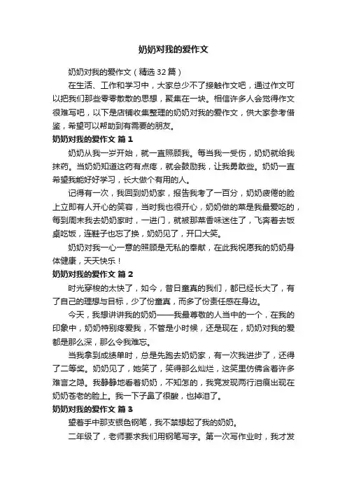 奶奶对我的爱作文奶奶对我的爱作文(精选32篇)在生活、工作和学习中,大家总少不了接触作文吧,通过作文可以把我们那些零零散散的思想,聚集在一块。