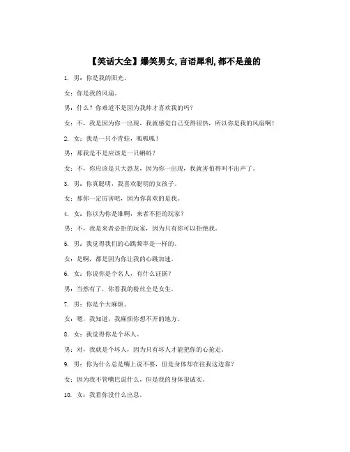 女:我没有戴帽子啊!男:那你头发真多啊!5. 男:你是我的世界上最重要的女人!女:谁还在世界上?男:对不起,我指的是这座房子。