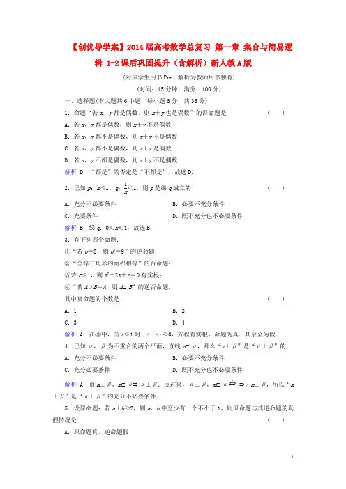 【创优导学案】2014届高考数学总复习 第一章 集合与简易逻辑 1-2课后巩固提升(含解析)新人教A 版(对应学生用书P 377 解析为教师用书独有)(时间:45分钟 满分:100分)一、选择题(本大题共6小题,每小题6分,共36分)1.命题“若x ,y 都是偶数,则x +y 也是偶数”的否命题是( ) A .若x ,y 都是偶数,则x +y 不是偶数B .若x ,y 都不是偶数,则x +y 不是偶数C .若x ,y 都不是偶数,则x +y 是偶数D .若x ,y 不都是偶数,则x +y 不是偶数解析 D “都是”的否定是“不都是”,故选D.2.已知p :x ≤1,q :1x <1,则p 是綈q 成立的 ( )A .充分不必要条件B .必要不充分条件C .充要条件D .既不充分也不必要条件解析 B 綈q :0≤x ≤1,故选B.3.有下列四个命题:①“若b =3,则b 2=9”的逆命题; ②“全等三角形的面积相等”的否命题;③若c ≤1,则x 2+2x +c =0有实根;④“若A ∪B =A ,则A ⊆B ”的逆否命题.其中真命题的个数是( ) A .1B .2C .3D .4解析 A 在③中,当c ≤1时,4-4c ≥0,方程有实根,命题为真.其余全为假.4.已知α,β为不重合的两个平面,直线m ⊂α,那么“m ⊥β”是“α⊥β”的A .充分不必要条件B .必要不充分条件C .充分必要条件D .既不充分也不必要条件解析 A 由m ⊥β,m ⊂α⇒α⊥β;反过来,α⊥β,m ⊂α⇒/ m ⊥β,所以“m ⊥β”是“α⊥β”的充分不必要条件.5.设原命题:若a +b ≥2,则a ,b 中至少有一个不小于1,则原命题与其逆命题的真假情况是( )A .原命题真,逆命题假B.原命题假,逆命题真C.原命题与逆命题均为真命题D.原命题与逆命题均为假命题解析A 可以考虑原命题的逆否命题,即a,b都小于1,则a+b<2,显然为真.原命题的逆命题,即a,b中至少有一个不小于1,则a+b≥2,为假,如a=1.2,b=0.2,则a +b<2.6.(2013·银川模拟)若a,b∈R,使|a|+|b|>1成立的一个充分不必要条件是( ) A.|a+b|≥1 B.a≥1C.|a|≥0.5,且b≥0.5 D.b<-1解析 D 当a=1,b=0时,都满足选项A,B, 但是不能得出|a|+|b|>1;当a=0.5,b=0.5时,满足选项C,但是不能得出|a|+|b|>1,故选D.二、填空题(本大题共3小题,每小题8分,共24分)7.有三个命题:(1)“若x+y=0,则x,y互为相反数”的逆命题;(2)“若a>b,则a2>b2”的逆否命题;(3)“若x≤-3,则x2+x-6>0”的否命题.其中真命题的个数为________.解析(1)真,(2)原命题假,所以逆否命题也假,(3)易判断原命题的逆命题假,则原命题的否命题也假.【答案】18.“a+c>b+d”是“a>b且c>d”的________条件.解析由于a>b且c>d可以推出a+c>b+d,而a+c>b+d不能得到a>b且c>d,所以“a +c>b+d”是“a>b且c>d”的必要不充分条件.【答案】必要不充分9.(2013·安庆模拟)若“x2>1”是“x<a”的必要不充分条件,则a的最大值为________.解析∵x2>1,∴x<-1或x>1.由已知x<a⇒x2>1,∴a≤-1,故最大值是-1.【答案】-1三、解答题(本大题共3小题,共40分)10.(12分)已知函数f(x)是(-∞,+∞)上的增函数,a、b∈R,对命题“若a+b≥0,则f(a)+f(b)≥f(-a)+f(-b)”.(1)写出其逆命题,判断其真假,并证明你的结论;(2)写出其逆否命题,判断其真假,并证明你的结论.解析 (1)逆命题:若f (a )+f (b )≥f (-a )+f (-b ),则a +b ≥0,真命题. 用反证法证明:假设a +b <0,则a <-b ,b <-a .∵f (x )是(-∞,+∞)上的增函数,则f (a )<f (-b ),f (b )<f (-a ),∴f (a )+f (b )<f (-a )+f (-b ),这与题设相矛盾,∴逆命题为真.(2)逆否命题:若f (a )+f (b )<f (-a )+f (-b ),则a +b <0,真命题.∵原命题等价于它的逆否命题,∴证明原命题为真命题即可.∵a +b ≥0,∴a ≥-b ,b ≥-a .又∵f (x )是(-∞,+∞)上的增函数,∴f (a )≥f (-b ),f (b )≥f (-a ),∴f (a )+f (b )≥f (-a )+f (-b ).∴逆否命题为真.11.(12分)已知不等式|x -m |<1成立的充分不必要条件是13<x <12,求m 的取值范围. 解析 由题意知:13<x <12是不等式|x -m |<1成立的充分不必要条件. 所以⎩⎪⎨⎪⎧⎭⎪⎬⎪⎫x ⎪⎪⎪ 13<x <12是{x ||x -m |<1}的真子集. 而{x ||x -m |<1}={x |-1+m <x <1+m },所以有⎩⎪⎨⎪⎧-1+m ≤13,1+m ≥12,解得-12≤m ≤43. 所以m 的取值范围是⎣⎢⎡⎦⎥⎤-12,43. 12.(16分)若ab ≠0,试证a 3+b 3+ab -a 2-b 2=0成立的充要条件是a +b =1. 解析 必要性:∵a 3+b 3+ab -a 2-b 2=0, ∴(a +b )(a 2-ab +b 2)-(a 2-ab +b 2)=0, 即(a +b -1)(a 2-ab +b 2)=0, 又ab ≠0,∴a 2-ab +b 2=⎝ ⎛⎭⎪⎫a -12b 2+3b 24≠0, 因此a +b -1=0,即a +b =1.充分性:∵a +b =1,即a +b -1=0,∴(a+b-1)(a2-ab+b2)=0,即a3+b3+ab-a2-b2=0.。