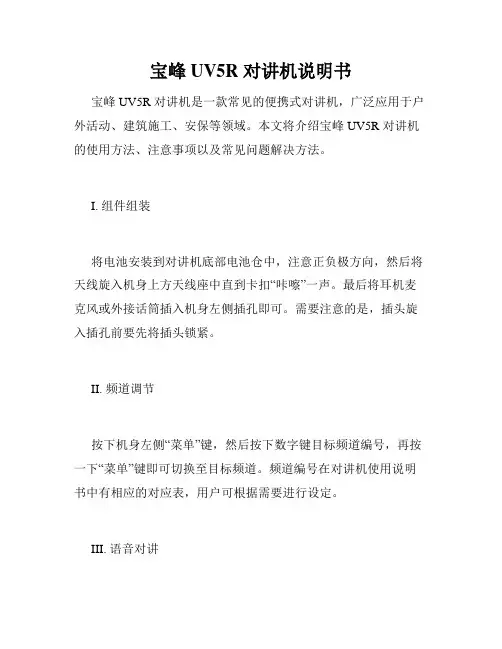 5. 附录泉盛对讲机的主要技术参数如下:- 工作频率范围:400-470MHz- 输出功率:5W- 功能特点:语音通话、频道切换、音量调节等- 尺寸:120mm×60mm×30mm- 重量:200g本说明书是泉盛对讲机的使用指南,希望能够帮助用户正确、便捷地操作该设备。