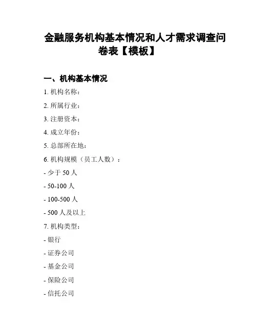 金融服务机构基本情况和人才需求调查问卷表【模板】一、机构基本情况1. 机构名称:2. 所属行业:3. 注册资本:4. 成立年份:5. 总部所在地:6. 机构规模(员工人数):- 少于50人- 50-100人- 100-500人- 500人及以上7. 机构类型:- 银行- 证券公司- 基金公司- 保险公司- 信托公司- 其他,请注明:8. 机构经营范围:- 金融咨询- 资产管理- 证券交易- 风险评估- 其他,请注明:二、人才需求分析1. 目前机构的人才招聘计划情况:- 正在招聘- 暂无招聘计划- 不确定2. 机构目前存在的人才缺口:- 高级管理人才- 技术人才- 金融专业人才- 市场营销人才- 其他,请注明:3. 对于招聘人才的要求:- 学历要求- 经验要求- 专业背景要求- 技能要求- 其他,请注明:4. 机构对应届毕业生的招聘态度:- 非常欢迎- 欢迎- 中立- 不欢迎5. 机构人才培养和晋升机制:- 内部培训- 外部培训- 岗位轮岗- 项目经历- 其他,请注明:6. 机构人才激励措施:- 薪资福利- 职业发展机会- 股权激励- 优秀员工表彰- 其他,请注明:三、问卷填写人信息1. 填表人姓名:2. 职务/职称:3. 机构部门:4. 联系方式:感谢您参与本次调查!您的回答对于我们的研究具有重要意义。