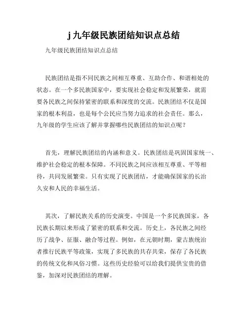 j九年级民族团结知识点总结九年级民族团结知识点总结民族团结是指不同民族之间相互尊重、互助合作、和谐相处的状态。