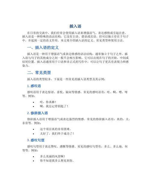 例如:•哇,你真棒!•啊,我忘记带钥匙了!2. 修辞插入语修辞插入语用于增强语气或表达强烈的情感。