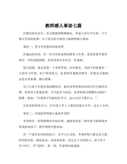 特殊教育教师感人故事特殊教育教师感人故事示例如下:1. 特殊教育教师感人故事:不放弃任何一个学生这位教师名叫艾米,她是一名资深的特殊教育教师。