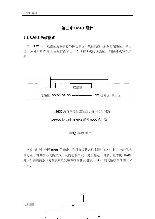 第三章UART设计3、1 UART得帧格式在UART 中,数据位就是以字符为传送单位,数据得前、后要有起始位、停止位,另外可以在停止位得前面加上一个比特(bit)得校验位。