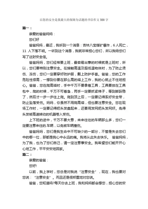以您的安全是我最大的保障为话题的书信作文500字篇一:亲爱的爸爸妈妈:您们好爸爸妈妈,最近,我听到一个消息:吉林八宝煤矿爆炸,6人死亡,11人下落不明。